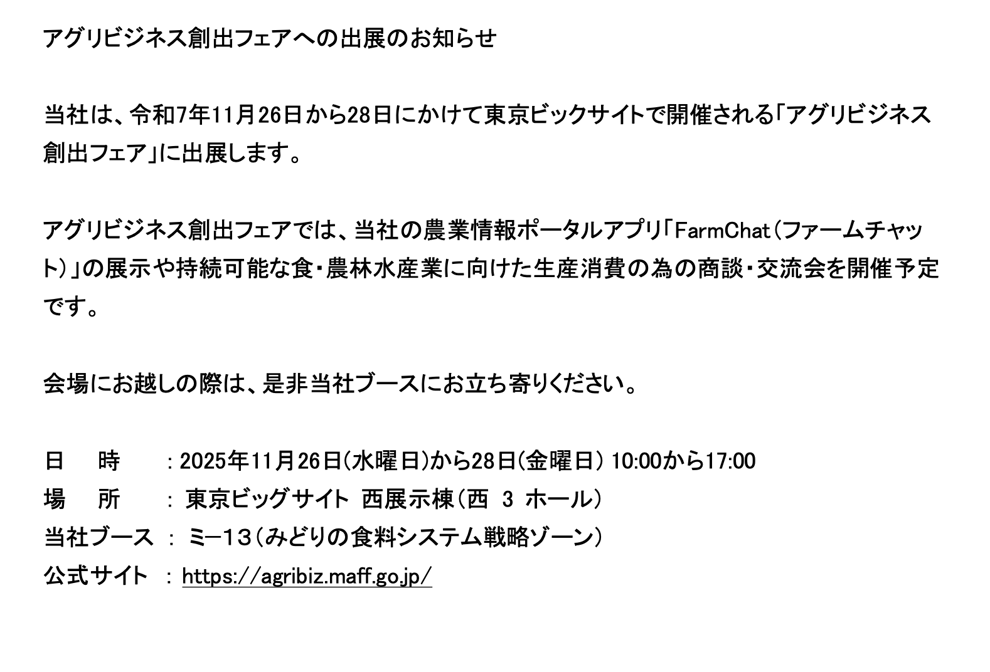 I ホーム I 国際認証グローバルGAPコンサルティング I 青果物卸売販売の支援 I 各種農業ICTサービス I 会社概要 I お知らせ I 採用情報 I お問い合わせ